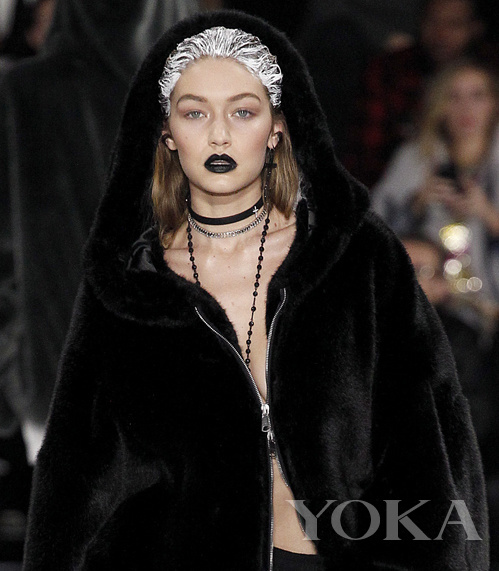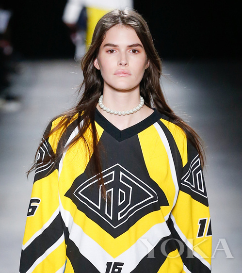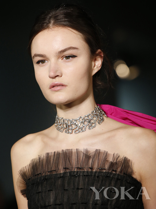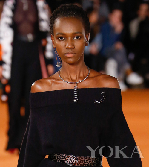 由蕾哈娜操刀设计的Fenty x Puma系列,也被搬上时装周秀场,不按常理出牌的蕾哈娜自然把模特佩戴的珠宝,也搞得与众不同,比如光杆儿戴黑色串珠长项链,首饰倒没看出亮点,锁骨好评。