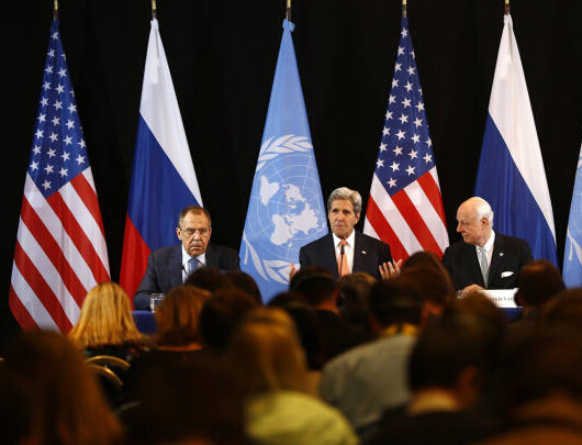 2月12日,在德國慕尼黑,俄羅斯外長拉夫羅夫、美國國務卿克里、聯合國秘書長敘利亞問題特使斯塔凡·德米斯圖拉(從左至右)出席會后舉行的新聞發布會。新華社/美聯