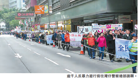 昨午3时许,逾千人游行队伍在工联会会长林淑仪、理事长吴秋北以及王国兴、郭伟强等立法会议员带领下,由湾仔港湾道公园出发,经菲林明道天桥、轩尼诗道、骆克道,游行至金钟警察总部。游行人士沿途高举「反暴力,守护香港」的标语和横额,高呼「本土反离、祸国殃民、严惩暴徒」等口号。警方派出约百名警员沿途维持秩序。