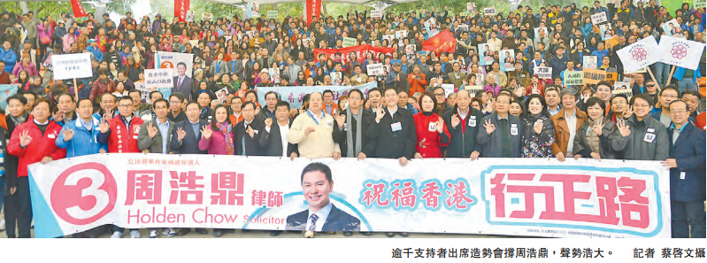 距离立法会新界东补选日子尚余不足1星期,各候选人的助选造势活动相继举行。由建制派唯一联合推荐的候选人、民建联周浩鼎昨日於大埔海滨公园举行「祝福香港行正路」造势活动,多个政商团体,包括民建联、工联会、经民联、新民党、新界乡议局、新界社团联会、香港福建社团联会、香港中华出入口商会、香港工商总会、港区省级政协委员联谊会、香港客属总会等均出席支持,场面及声势浩大。