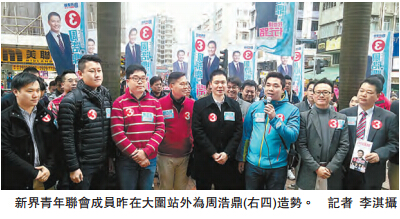 立法会新界东补选将於本周日举行,新界青年联会昨日与数十名成员於港铁大围站举办「香港行正路」宣传活动,为3号候选人周浩鼎造势。民建联立法会议员陈恒镔、何俊贤、青年民建联主席颜汶羽,以及多名民建联年轻区议员与青年社团领袖代表等亦有出席,他们高叫「珍惜香港行正路」、「不要拳头、不要石头,要周浩鼎为新界东出头」等口号,以年轻人正确姿态向激进派说不,亦呼吁市民支持年轻专业的正能量进入议会,踢走反对派「拉布、冲击」的歪风,让香港行正路。