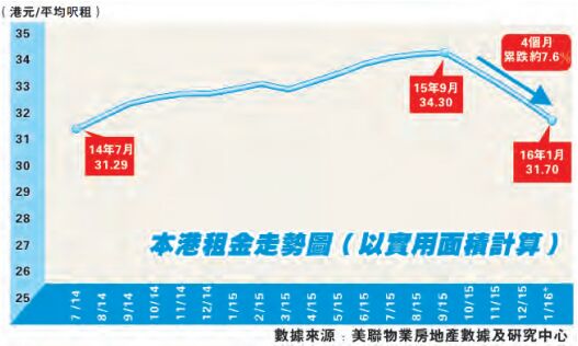 事實上,本港私宅租金自去年9月后便隨樓價展開調整,據美聯「租金走勢圖」顯示,私宅平均尺租於去年9月創下34.3元高位后,隨后無以為繼,連續4個月錄得下跌,累積跌幅達到約7.6%。