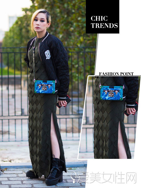 最后再给你们介绍这一条,菱形的编制橄榄色连衣裙,侧开衩有没有点像我们的旗袍呢?搭配飞行外套更具年轻人的个性,不过小编觉得那双靴子略显笨重了,换双短靴或马丁靴的会更好哦!