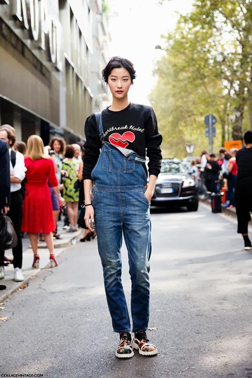 除了搭配高领衫,冬天穿背带裤你还可以这么搭: