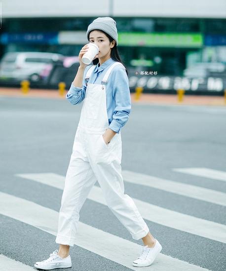 Tips:白色背带裤 一般来说白色背带裤都是不好搭配的一类,其实你可以搭配有颜色的衬衫或者是条纹和格子衬衫,也可以搭配横条纹的上衣。 Tips2:大胸穿背带裤 背带裤大多是小胸妹在穿。大胸妹穿背带裤要么像这样撑的走形,显得很壮硕,那大胸妹如何能穿的好看呢?背带裤的前面最好在胸部最高峰以下,不要一大片把胸部腰部一起遮住,就一点腰线也看出来了。 胸大选择长带子的背带裤好看些,不要硕大不要有走形的感觉,身材有优势要尽量展示出来。
