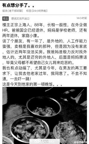 “上海女孩因为一顿年夜饭与江西男友分手”事件,源于上海本地的网络社区篱笆网一篇题为《有点想分手了》的帖子(见左图)。因此事涉及“凤凰男”和“孔雀女”,以及城乡差异等热门话题,因此关注度极高。浏览量突破30万次,微博评论量高达20万条。