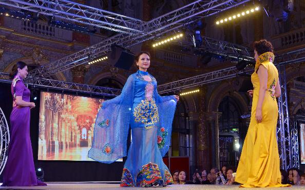 当地时间2月24日晚,2016年世界旅游小姐(MTI)环球金色使者海外表演赛在巴黎的洲际酒店举行。这批年龄在40至70岁之间的MTI金色使者中国总决赛冠军及精英选手上演巴黎首秀,向西方观众展示东方成熟女性和中国传统服饰之美。