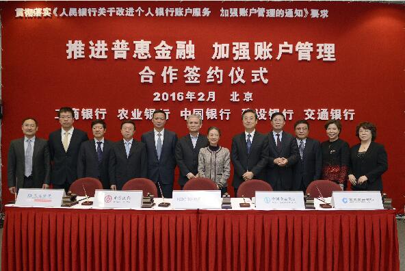 2月25日,中国五大国有商业银行:中国工商银行、农业银行、中国银行、建设银行、交通银行罕见联手,在北京举行签约仪式,共同推出多个举措加强账户管理。五家银行还共同就推进落实普惠金融、加强银行个人账户管理向社会和各银行业金融机构发出倡议。