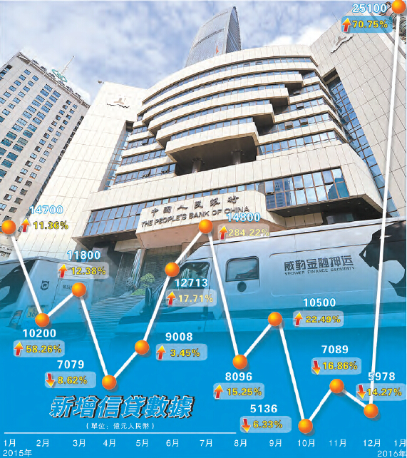 雖然在1月中旬,人行曾召開座談會要求銀行放緩信貸投放,但1月新增人民幣貸款仍高達2.51萬億,創出有歷史紀錄以來的單月最大規模,這也是單月新增貸款首次突破2萬億元,顯著超出市場預期。接受本報采訪的中國社科院金融所貨幣理論與政策研究室副主任楊濤認為,1月的特殊信貸規模背后存在以下三方面原因,一是年初信貸增長是一個比較普遍的情況,往年也有。二是今年是「十三五」開局之年,去年國家發改委已經立項了很多投資項目,隨著這些項目在今年要陸續開展,必然帶來信貸增長。三是存在季節性因素,今年的春節在2月份,所以1月份會存在趕著上項目的情況。