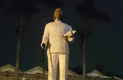 据台湾《联合报》报道,云林科技大学蒋介石铜像是云林县硕果仅存的铜像,昨天有学生发现位于校园云旭楼前方的蒋介石铜像,全身被喷上白漆,并以棉花做成胡子及白发黏上,手上还放个炸鸡桶,简直像是肯德基爷爷重现江湖。此举在“二二八”前夕让人觉得特别敏感。