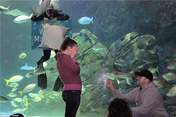 据英国《每日邮报》2月22日报道,在一场浪漫幸福的求婚仪式上,呆萌的刺鳐不仅见证了这一时刻,还成功抢镜。来自加拿大的克里斯•哈默为未婚妻泰勒•麦凯精心设计了一场浪漫的水下求婚:在他们参观水族馆的时候,潜水员举着求婚告示牌出现在泰勒面前。