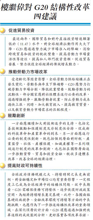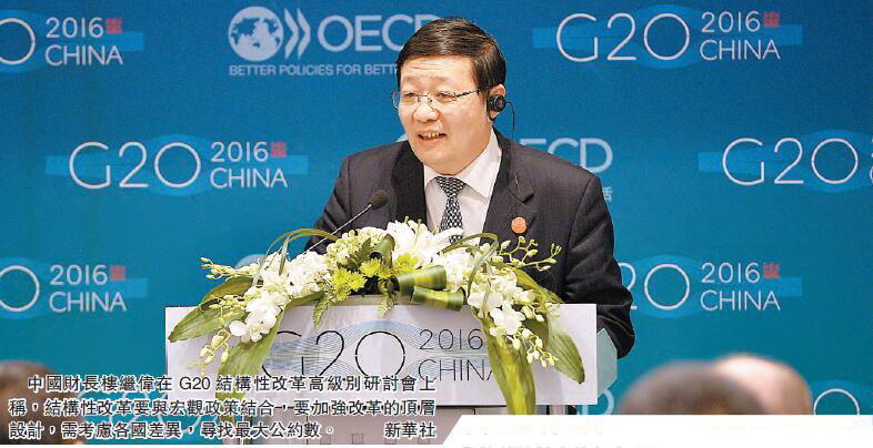 【香港商報网綜合報道】作為G20財長和央行行長會議配套活動的G20結構性改革高級別研討會,昨日在上海舉行。中國財長樓繼偉表示,當前全球經濟仍面臨嚴峻挑戰,結構性改革要與宏觀政策結合,講順序、講配套,要加強改革的頂層設計,需考慮各國差異,尋找最大公約數,制訂G20結構性改革的優先領域和一般原則,最大發揮改革的正面效應。