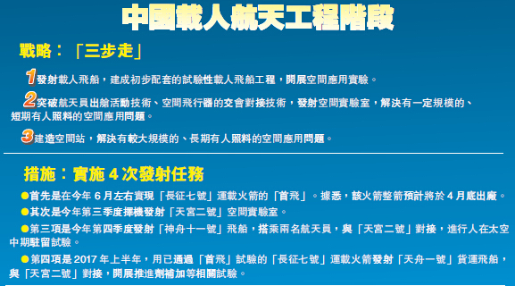 發言人表示,中國將於今年中至明年上半年間,組織實施載人航天工程空間實驗室任務。空間實驗室任務是中國載人航天「三步走」發展戰略的重要組成,標誌中國載人航天進入應用發展新階段。期間將驗證貨物運輸和推進劑在軌補加,以及航天員中期駐留等空間站建造與運營的關鍵技術,開展較大規模的空間科學和應用試驗。