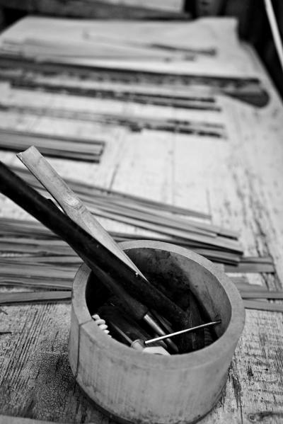 只靠一个电暖器取暖的工坊里寒气逼人,堆满了竹料,工作台上还有未完成的扇骨。郑高套上一件工作用的外套,上面满是尘土与竹屑,他随手拿起一把式样奇特的弯刀,娴熟地把一块竹料劈成薄薄的小片,做着做着竟入了神,一时忘了还有来访者。