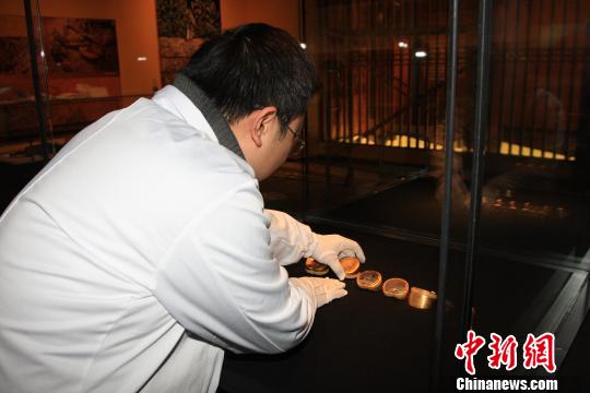 中新网北京2月29日电 《五色炫曜——南昌汉代海昏侯国考古成果展》将于3月2日在首都博物馆开展,届时将展出瓷器、玉器、青铜器、竹木牙角家具等441组件珍贵文物。其中在主椁室内发现的金饼和马蹄金数量,创下了我国汉墓考古史上之最。