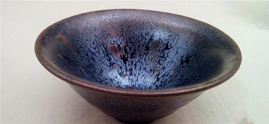 那么这黑黑的小碗又好在哪里呢?就算有些兔毫似的纹样,也还是矮小粗黑,如何登得大雅之堂?其实建盏乍看黯淡,但是细观会发现青黑的釉面光亮如墨玉,灵动的纹样或如兔毫,或如银萍,或如星辰,或如山海,耐人玩味,大可神游!只有深入欣赏才能发现它的华丽。宋人欣赏建盏会在阳光下侧看,这样才能比较清楚地看到引人入胜的花纹,而现在,我们大可以借助放大镜,轻易地进入建盏的绚丽世界,不过出来时往往会因流连太久而头晕眼花。建盏之美安静而不事张扬。这种美绝没有姹紫嫣红,波涛汹涌,起初并不吸引人,就这样呆在那里,静如处子,等待能欣赏建盏之美的人深陷其中。而方家们都知晓,这样的美虽多耗人工,但关键却靠天成,大美之物,往往是万里成一,而诸如曜变、异毫之类的绝品,则只能祈祷窑神的恩赐。这也就无怪乎连宋徽宗这样的风雅皇帝也会视之如随珠和玉了。