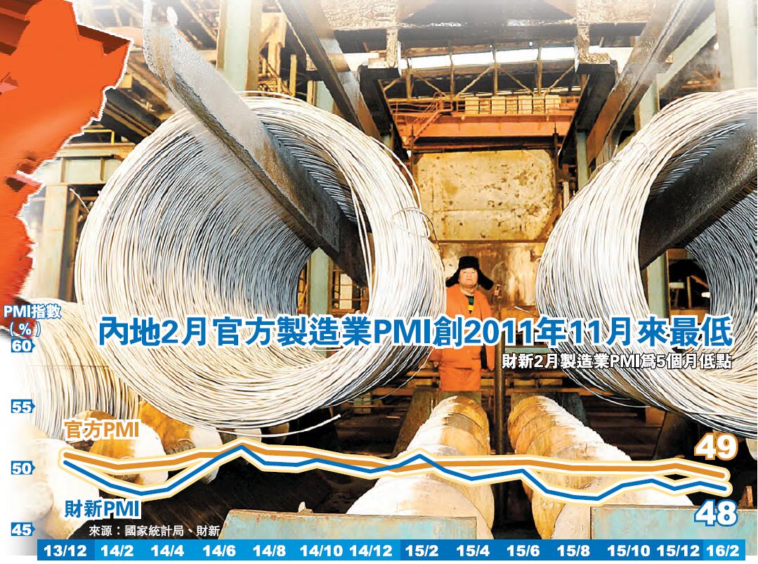 同一日,财新/Markit亦联合公布数据,内地2月份制造业采购经理人指数(PMI)降至48%,为去年9月以来最低水平;其中,产出与新订单微幅下滑,导致就业指数创下2009年1月以来的最低位。