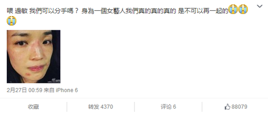 前几天舒淇在微博上发了这样一张照片,图中的她脸上多处发炎引起红斑,好端端的性感女神没逃过过敏的一劫。