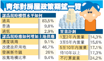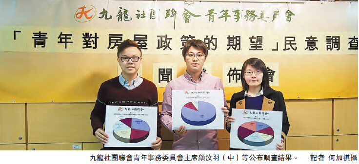 九龍社團聯會於1月25日至2月2日期間,以電話系統隨機抽樣方式,訪問了1121名年齡16至34歲的青年人,發現有三成一人認為在《施政報告》中沒有宣布「減辣」,會妨礙自身的置業計劃。亦有逾三成人認為置業需時5至10年,較希望在1至5年內可置業的人為高,反映年輕人對置業的期望高,但短期內難以實現。此外,亦有八成三人認為目前的樓價過高,而且有近四成人認為,公私營房屋供應不足,而認為公營房屋不足的問題嚴重則有逾四成人,反映青年人非常依賴公營房屋去解決自身的居住需求。