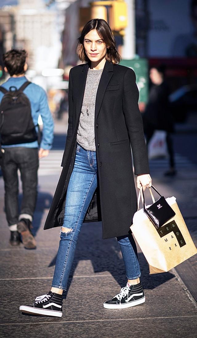 像九分牛仔裤搭配小黑鞋就没的说,比如钟小姐的这身搭配,她选择的是Vans sk8-hi系列高帮鞋配牛仔裤哦,如果不喜欢高帮鞋,也可以试试Vans old skool低帮系列。
