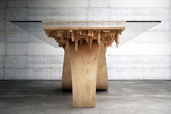 一月份我们介绍过塞浦路斯设计师Stelios Mousarris打造的“波浪城市/Wave City”咖啡桌。以木材、钢片为材质,用3D打印技术制作,设计师创建了一张卷曲叠立起来的咖啡桌,而卷曲的桌子内面则有经过精细雕琢、连续而又对立的城市风景。设计师在这个主题上继续发力,带来了这款升级版版的餐桌。其长宽高尺寸均有所增加,呈现起伏的S形,并在顶部放置了一张玻璃面板充当桌面。