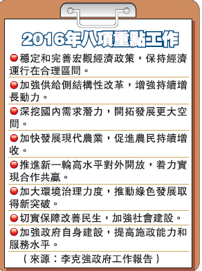 李克強在政府工作報告中談及2016年重點工作時說,今年發展的主要預期目標是:GDP增長6.5%至7%,居民消費價格漲幅3%左右,城鎮新增就業1000萬人以上,城鎮登記失業率4.5%以內,進出口回穩向好,國際收支基本平衡,居民收入增長和經濟增長基本同步。單位GDP能耗下降3.4%以上,主要污染物排放繼續減少。