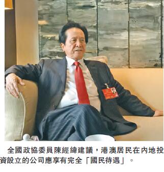 【香港商報網訊】兩會特派采訪組報道:港人在內地投資設立企業,受到多種行業準入限制;而近年港資企業在內地融資難、融資貴等問題也愈發突出。港區全國政協委員、全國工商聯副主席、香港中國商會主席、香港經緯集團董事局主席陳經緯在今年的兩會帶來提案,建議港澳居民在內地投資設立的公司應享有完全「國民待遇」。