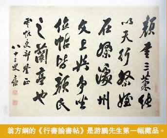 2005年,游鵬接觸到一些收藏界朋友。據游先生回憶,他第一次在玩收藏的好友家里看到這幅《行書論書帖》時,向主人吐槽說,「這幅書法怎麼這麼不好看?」友人問他,「什麼樣的字才漂亮?」他答,「端端正正才漂亮」。之后友人告知,此幅書法乃300多年來排名第一的清朝書法家翁方綱所書,而它的好,在於爐火純青帶有靈性。游先生說自己聞之甚感慚愧,因感自己沒有讀書而出此言,遂將字又看了半個多鐘,回家亦念念不能忘記。隔一周,他再到友人家,「第三次看的時候,就喜歡上了」,且冒昧懇求友人出讓這幅字,友人言若真心喜歡就送他,最后因游先生堅持「無功不受祿」而以3.8萬元買下。盡管當時覺得買幾個字要幾萬實在「很貴」,但游先生說他每每看著字,心里是高興的,「精神舒暢得到放松」。由此開始,游鵬愛上傳統名家書畫,也因此結緣收藏行業,隨后一發不可收拾而「走火入魔」。本次展覽中,游先生將此幅頗具深意的作品置於展廳的近入口處,以代表其藝術收藏的開始。