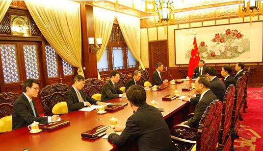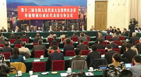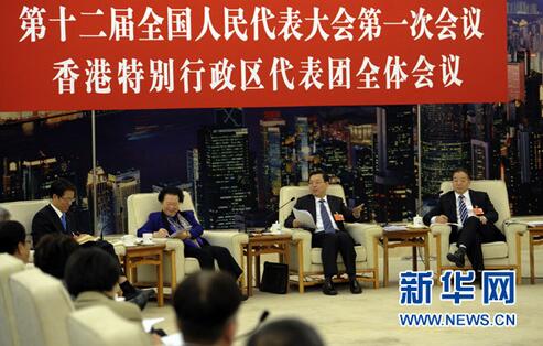 张德江(中)昨日会见港区全国人大代表团。左为港区全国人大代表团团长、基本法委员会委员谭惠珠,右为港澳办主任王光亚。