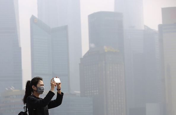 3月7日,上海已经进入春季。图为一名戴着口罩的女孩当天在上海高楼林立的金融区拍照。
