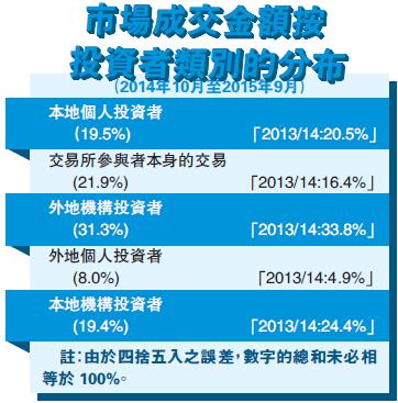 至於香港、外地及交易所參與者占整體成交比例方面,外地投資者占整體成交比例為39.3%,較2013/14年度的38.7%輕微上升0.6個百分點;至於香港投資者占整體成交比例,則由2013/14年度的44.9%,下降6個百分點,至38.9%。交易所參與者占整體成交比例,則按年上升5.5個百分點,至21.9%。