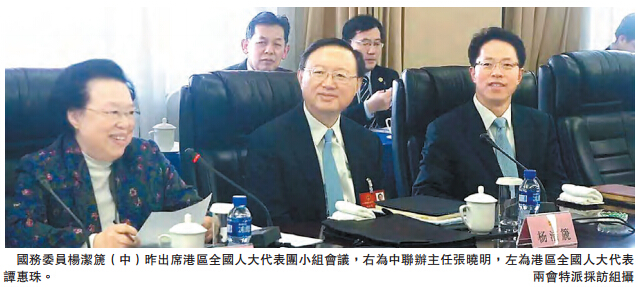 【香港商报网讯】两会特派采访组报道:国务委员杨洁篪昨日出席港区全国人大代表团小组会议,与港区代表一同审议《政府工作报告》及「十三五」规划草案并进行交流。杨洁篪表示,非常关心香港的繁荣稳定及发展,强调中央对港澳的基本方针政策是一贯的、坚定的,希望港区代表继承和发扬爱国爱港光荣传统,坚持全面准确理解和贯彻「一国两制」方针,继续支持特区政府依法施政。国家旅游局局长李金早、中联办主任张晓明亦有出席会议。