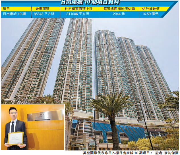 日出康城10期地皮位於日出康城的西南角位置,屬臨海地皮,占地約8.58萬平方尺,可建樓面約81.2萬平方尺,料可興建兩幢住宅項目,最多可提供1170單位,預期於2022年竣工。早前有市場消息指出,項目補地價16.59億元,每尺樓面地價為2044元,較去年底批出的第9期項目低約兩成,重返2014年3月推出的第4期項目水平(第4期每尺樓面補地價為2059元),而港鐵的分紅比例固定為兩成。