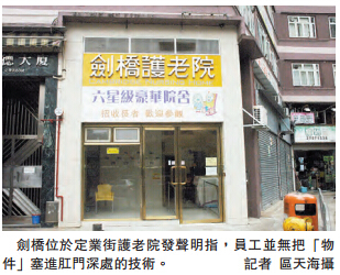 【香港商报网讯】记者冯仁乐报道:一名六旬智障男子,两月前在其入住的护老院感不适,肚泻及肺部感染送院,期间医护人员发现其肛门藏有异物,事主两日后死亡,事主家属报警求助。涉事护老院发声明指,员工并无把「物件」塞进肛门深处的技术,且在没有麻醉情况下亦无法做到,会对事件严肃处理。劳工及福利局局长张建宗表示社署会跟进事件,调查完成后会向公众交代。