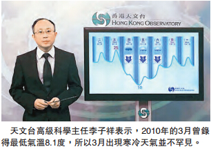 受一股温暖海洋气流影响,未来两日一道冷锋会在明晚横过华南沿岸,与其相关的强烈东北季候风,会在本周后期带来寒冷及有雨的天气,今天日间气温仍有20多度,但至周四、五最低气温跌至10至11度,风势颇大及有雨。极端寒冷天气机会不大天文台高级科学主任李子祥表示,3月初的北极涛动指数没有出现一个很强负值的情况,跟1月出现比较强负值的情况仍有一段距离。他指出,冷空气和寒潮是否能到达华南,要视乎冷空气爆发的地点,以及之后的路径如何。