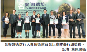 由土木工程拓展署举办的「名系启德坊行人专用街道命名比赛」圆满结束。土木工程拓展署署长锺锦华主持典礼指,比赛徵集了共超过900份作品,反应热烈;大部分参赛作品均极具创意,并能展现启德坊独特的社区特色。其中公开组和学生组冠军作品不但配合启德发展的主题,更反映参赛者对该计划的期盼,宣扬了狮子山下、同舟共济的精神。