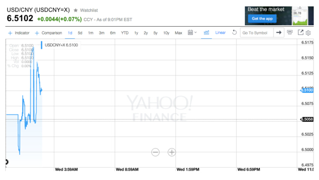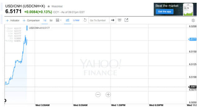 在岸人民幣兌美元盤初也走低至6.5171,較上日官方收盤價跌超百點。目前震蕩反彈至6.5102。