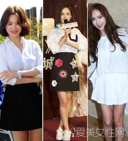 白衬衫搭配高腰的A字裙,不仅可以提高腰线,拥有大长腿,A字裙摆还能顺便遮住小粗腿呢。乔妹在第67届戛纳电影节就以白衬衫来搭配一条黑色的A字裙和黑色的高跟凉鞋,即是全身只运用了黑白两色,但却足够的端庄优雅,bobo短发尽显俏皮气质。大幂幂的这身look其实跟乔妹的差不多,不过裙子上多了一些刺绣图形的点缀。Jessica近日出席Ann Demeulemeester巴黎时装周时,则用白衬衫搭配白色短裙,化身洁白天使。