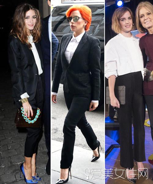 代表人物:奥利维亚·巴勒莫(Olivia Palermo)&Lady Gaga&艾玛·沃特森(Emma Watson) 美国第一名媛奥利维亚一身西装搭配白衬衫,西装外套微微敞开,再穿上高跟鞋,随意散下的卷发更添女人味。Gaga小姐也有正经的时候啊,扣齐了衬衫和外套的纽扣,气场十足。才女艾玛以短款的白衬衫搭配西装裤,摆脱了老气和乏味感。 代表人物:唐艺昕 最近唐艺昕在某水果台的热播剧《因为爱情有幸福》中扮演一名编剧的角色,各种白衬衫的穿法更能展现现代独立女性的形象。 想学白衬衫如何穿出休闲感的看这边! 代表人物:唐嫣&奥利维亚·巴勒莫(Olivia Palermo) 表姐刘雯出了名的好衣品,看她一身白衬衫随意地扎进牛仔裤内就非常好看了,丝毫不见白衬衫的白领feel。杨幂用白衬衫来搭配黑色铅笔裤,外加一件千鸟格大衣,牛津鞋和礼帽的搭配更增加英伦风。奥利维亚则用白衬衫来搭配阔腿裤,这样穿休闲了几分,跟着名媛出镜了无数次的长款马甲大衣更使搭配形成一体,走路都有带风感了。