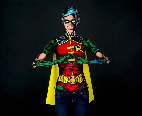 图三:这张照片是蝙蝠侠的死党罗宾。凯说,虽然她可能为艺术而裸身,但自己用乳胶遮蔽了私密部位。