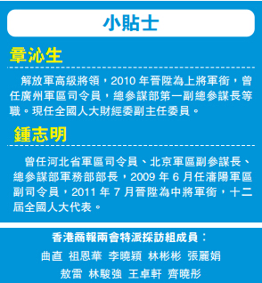 至於部门增多,领导数目也增加了,军中有传言会增加军委委员的数目,甚至增加军委常委。章沁生肯定地讲:「不会增设军委常委。」而锺志明也表示:「没有这种说法。」他指出,即使要增加军委委员数目,也是下一步的事,现在不用考虑,领导数目近期内不会变。他表示,部门多了以后,都有职能分工,属於作战指挥的有哪几个部门,哪些是管训练,对下不会出现乱的次序,暂时会保持现状。