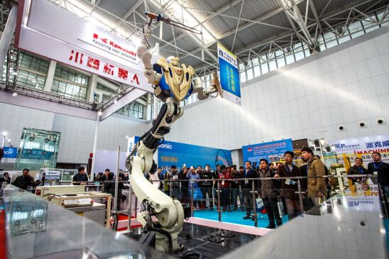 3月9日,在第五屆中國(天津)國際機器人展覽會上,一家日本參展企業的機器人在隨著節拍揮劍起舞。