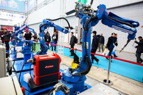 在第五屆中國(天津)國際機器人展覽會上,一家參展企業的工業機器人在隨著節拍“起舞”。