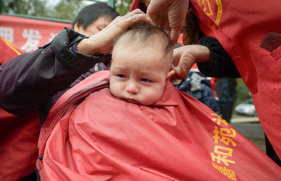 3月10日,志愿者在合肥市嘉和苑社区为陈一博小朋友免费理发。