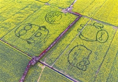 这些油菜花田里的图案是怎么创作出来的?记者了解到,这些创意都来自大学生村官李嘉佳等人之手。“最考验手艺的是创意。光创意就花了3个月,实施就10多天时间。”李嘉佳介绍,去年合作社绘制了三个图案,深受游客和群众喜爱。所以,今年油菜还没有播种,他们就开始规划,最终决定了这些图案。