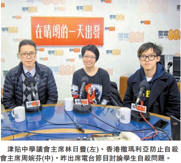 此外,津貼中學議會主席林日豐昨於一個電台節目上指出,教育局公布的5項短、中、長期措施,部分措施包括5場大型研討會將會首先進行,供教師家長參與,他認為將成立的專責委員會,可以探討學生功課量與壓力的關系,社會在更長遠層面,亦應思考子女能否承載家長各種各樣的期望;出席同一節目的撒瑪利亞防止自殺會主席周婉芬表示,現時最大困難,是不少自殺者都不願意向人透露情緒,甚至假裝無事,亦有青少年傾向在網絡平台透露想法,但回應者應負責任,不要作負面或敷衍回覆。