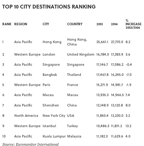 报道称,欧睿信息咨询公司最近发布的“全球100座旅游目的地城市排行榜”基于2014年的数据。在这份榜单上,有700万居民的香港是无法撼动的榜首。中国的这个特别行政区得益于中国内地游客:2014年造访香港的2780万人次中的67%来自中国内地。但香港作为旅游城市所面临的风险同样在于对中国内地游客的依赖,因为他们越发倾向于去西方国家展开购物和文化旅游。
