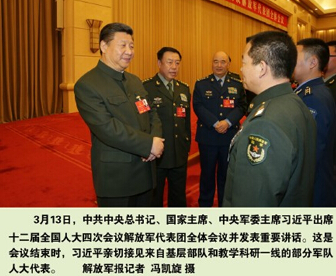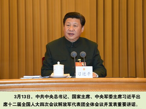 中共中央总书记、国家主席、中央军委主席习近平13日下午在出席十二届全国人大四次会议解放军代表团全体会议时强调,把创新摆在我军建设发展全局的重要位置,靠改革创新推动国防和军队建设实现新跨越,是决定我军前途命运的一个关键,必须全面实施创新驱动发展战略,坚持战斗力标准,下大气力抓理论创新、抓科技创新、抓科学管理、抓人才集聚、抓实践创新,以重点突破带动和推进全面创新,不断开创强军兴军新局面。