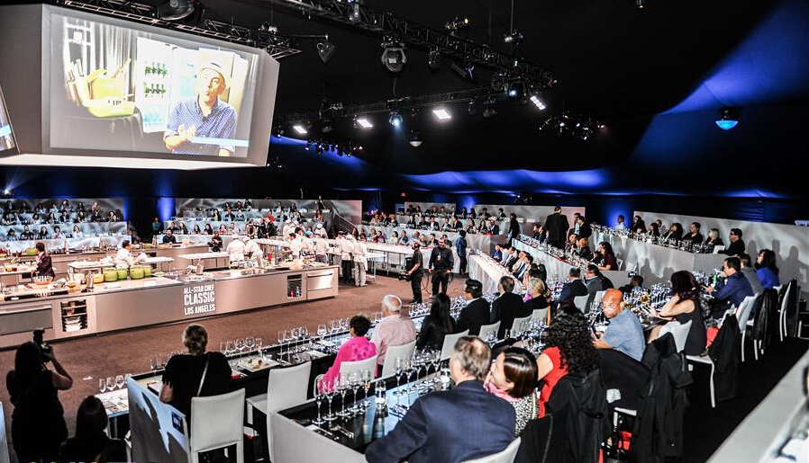 在美國洛杉磯舉行的2016洛杉磯經典全明星廚師廚藝大展的“東西方之夜”上,現場觀眾觀看廚師準備菜肴。
