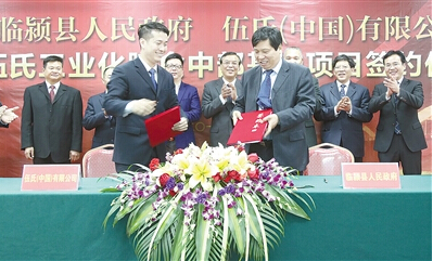 經過一系列對接洽談,在馬正躍、孔祥智、伍維民見證下,伍氏膳食工業化中部基地項目正式簽約。該項目計劃投資10億元,占地300畝,將在臨潁建設中部最大的膳食工廠化生產基地。